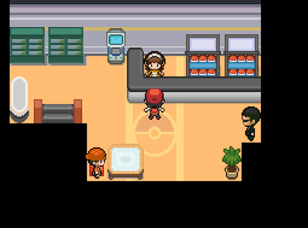 2、进入宝可梦中心后,直接上二楼,与最里面的黑色西服npc对话,
