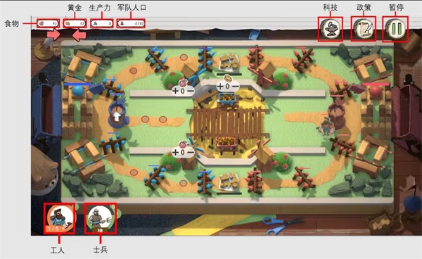 采集资源的单位。通过点击地图中对应的加减号进行派遣与召回。上下路的资源为食物,路程较短,采集时间也较短;中路的资源为黄金,路程较长,采集时间也较长。