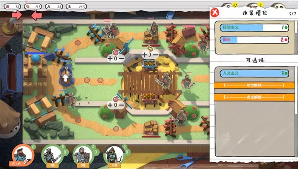 在游戏界面下方可以看见您的士兵图标,下方黄色方框代表该兵种价格,右上角代表可派遣士兵数量。士兵会自动生产直到达到预备役上限,每种士兵有不同的预备役数量。点击士兵图标后会显示预派遣数量,同时地图上会出现三个箭头,点击箭头即可向对应路派兵。注意,当军队人口达到上限时将无法派兵。