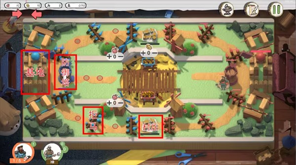 战斗单位。点击游戏下方对应图标购买。下方黄色方框内数字代表价格,右上角小圈最上方数字代表闲置数量,其下方数字代表当前场上该士兵的数量数量。点击士兵图标后会显示预派遣数量,同时地图上会出现三个箭头,点击箭头即可向对应路派兵。军队人口达到上限后将无法派兵。