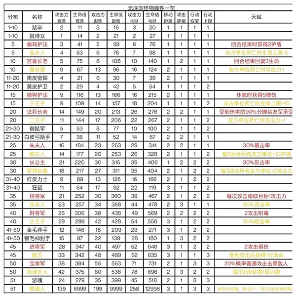 难度:不同难度仅怪物攻击力和生命值不同,均为51层。以困难难度的怪物攻击力和生命值为单位1,则普通难度为0.7,地狱难度为1.3(小数均向上取整)。