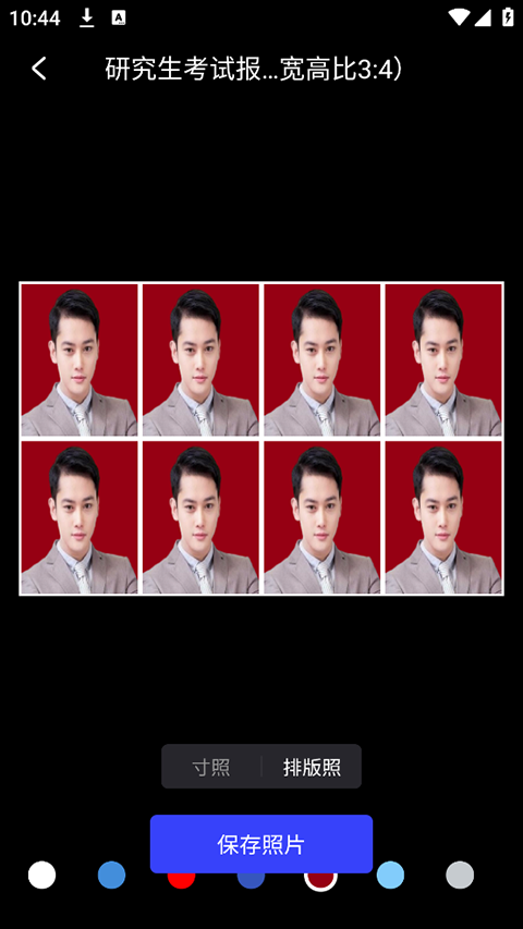 5、然后在导入或拍摄照片成功后即可在打开的照片处理界面中点击底部的照片底色选项板中的任意颜色进行更换照片底色