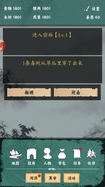 4、我们进入密林,毒蛇来了,我们可以选择躲避或者迎击。