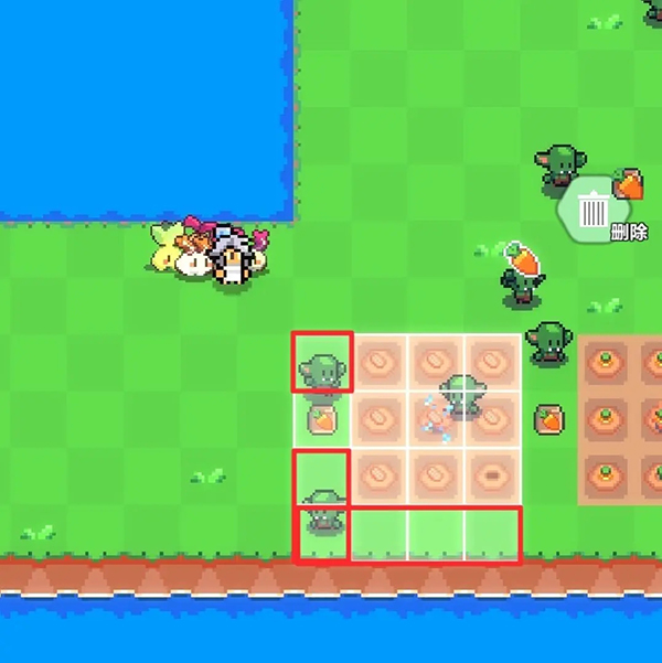 5、假设我们要将农作物移动到图中红色大方块区域,则洒水器应该处于红色小方块区域。