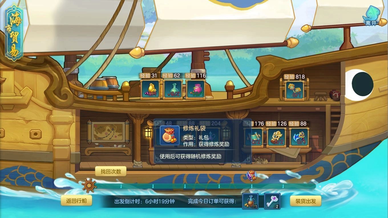 3、海市贸易(修炼经验):简单的说就是收集货船需要的物品,让车队出发并获得修炼经验,这个是修炼经验的主要来源,达到一定进度时还送修炼丹,千万不能错过。