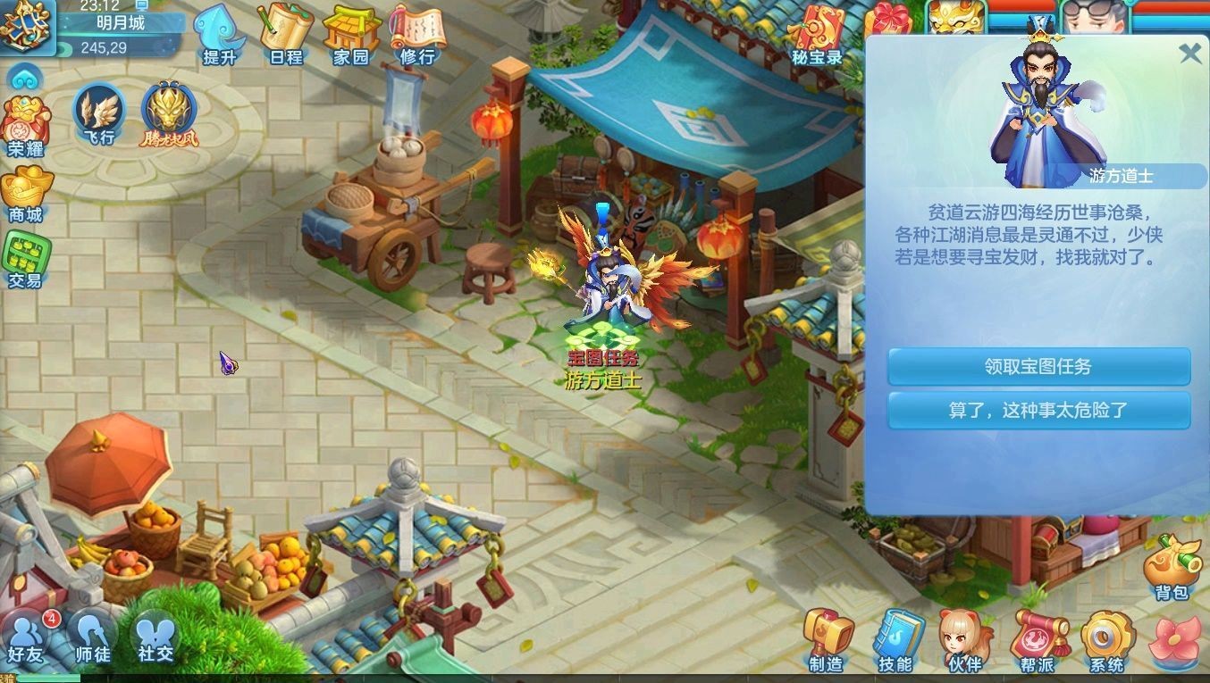 2、宝图任务(梦想币):每天能完成15次(通过时光轮加速可直接获得宝图手册)。通过战斗完成宝图任务获得高级宝图,使用高级宝图挖宝可获得各种物品,出售挖到的物品可以获得数量可观的梦想币。