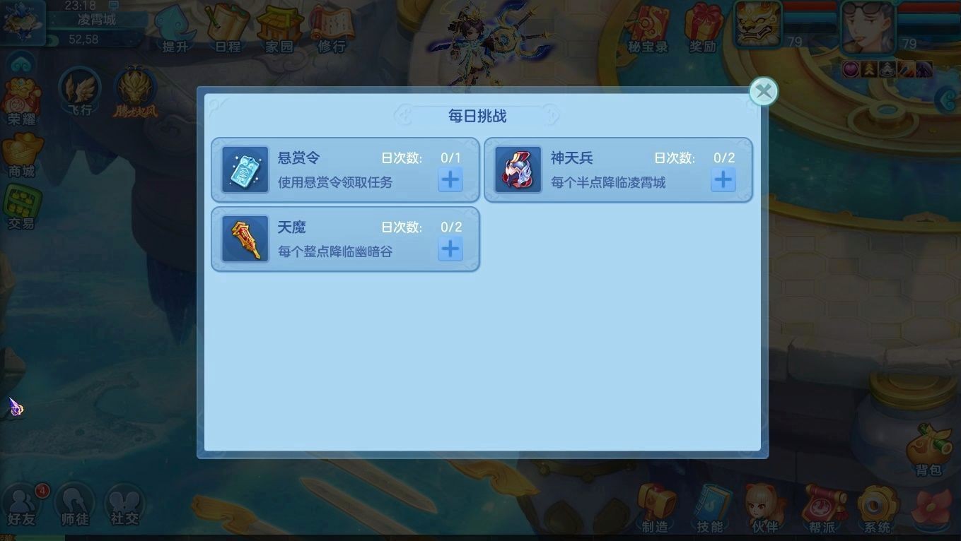 7、每日挑战(梦想币):俗称221,由2次神天兵,2次天魔和1次悬赏令组成,是难度较高的日常玩法,同时奖励也相当丰富,有几率获得仙兽石、高兽决等高价值奖励,可以通过使用天兵令、天魔令及悬赏令获得相应任务,也可以在野外寻找刷新的怪物挑战。