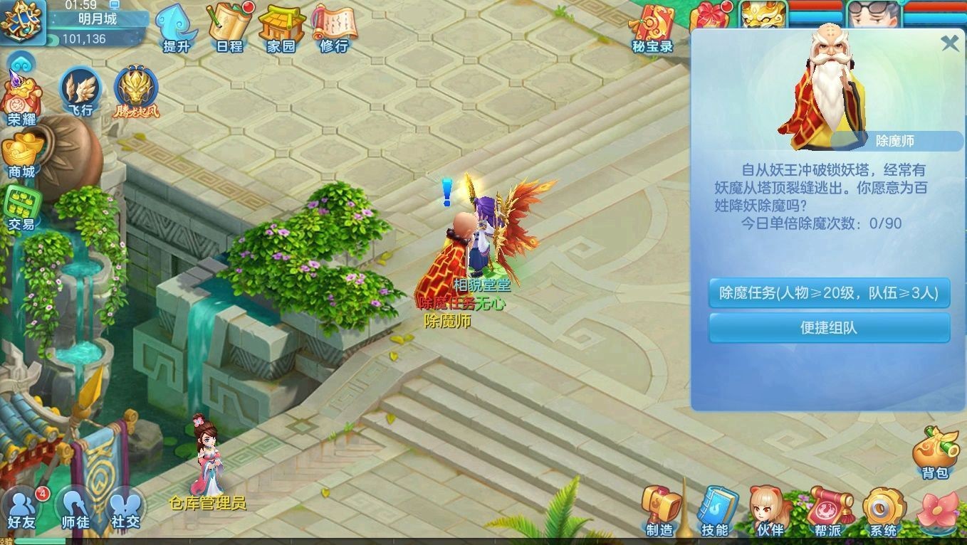 8、除魔(经验,银两):人物和宠物经验最主要来源,除魔前可选择领取至多60点双倍,每日单日除魔能获得经验的次数最多为90次,超过90次后除魔仅能获得宠物经验,如果需要练宠可以选择继续。另外除魔还可以获得不少的环装,通过摆摊出售可获得不少的银两。