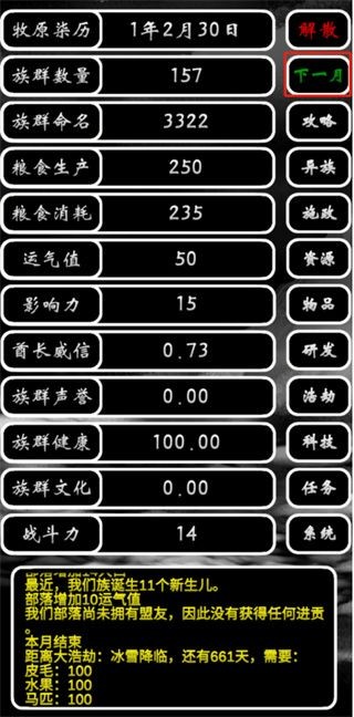 1、双击打开部落模拟器游戏,点击下一月即可开始游戏;