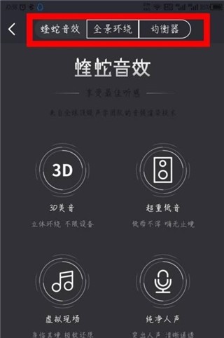 4、然后能看到顶部的菜单选项,可以选择蝰蛇音效全景环绕和均衡器。如图所示