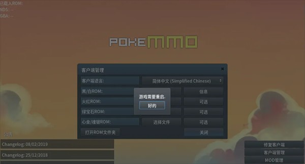 5、这时候,点击主界面的关闭按钮,系统会提示游戏需重启,点击好的以后,系统就自动重启了