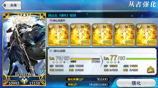 如上图所示,在选择好了要强化的从者以及消耗的狗粮卡牌后玩家就可以看到当前从者的等级、攻击力(ATK)和血量(HP),以及强化后的等级、攻击力(ATK)和血量(HP)。