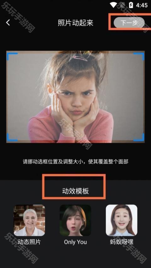 2、挪动选框位置及调整大小,使其覆盖整个面部,选择“动效模板”,有三种模板可供选择,点击“下一步”等待动态图片生成完成即可。