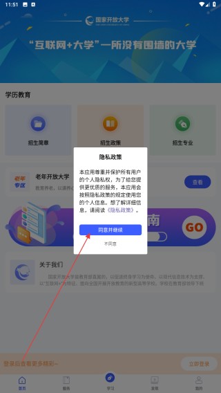 1、打开i国开大学,在隐私政策弹窗点【同意并继续】。
