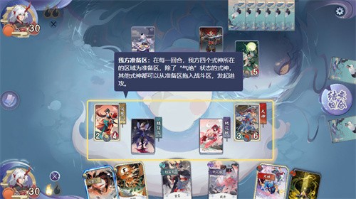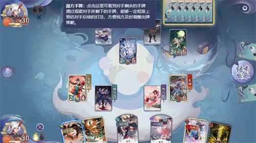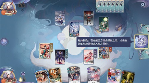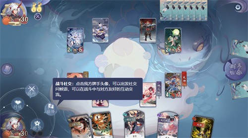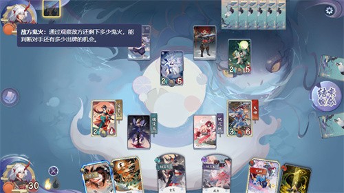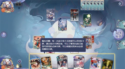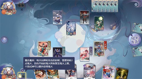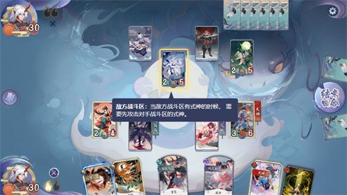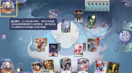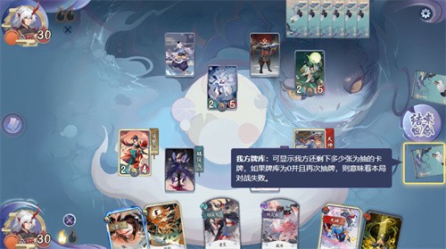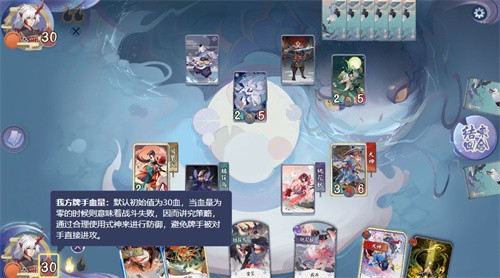我方牌手血量:默认初始值为30血,当血量为零的时候则意味着战斗失败,因而讲究策略,通过合理使用式神来进行防御,避免牌手被对手直接进攻。