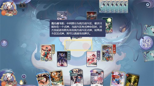我方战斗区:中间部分为我方战斗区,最多只能存在一个式神,当战斗区有式神存在时,对方发起进攻将先攻击我方战斗区式神,如果战斗区没式神,则可以直接攻击牌手。