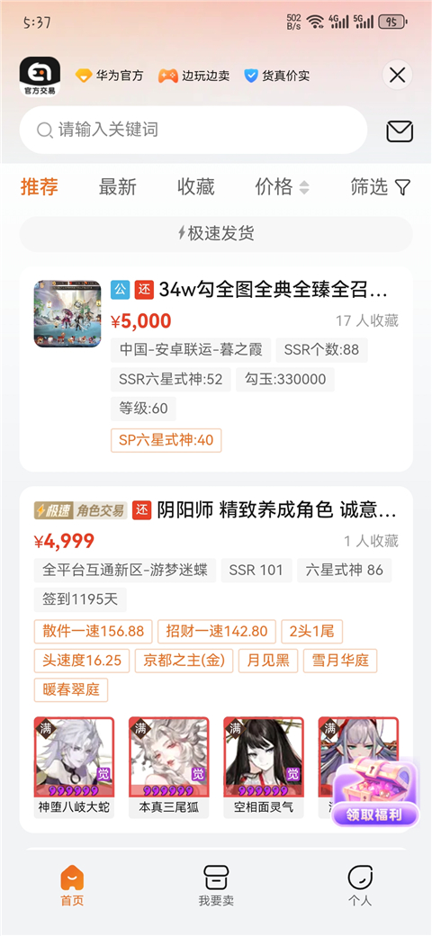 藏宝阁华为渠道服是一款游戏交易类的软件,在其中为你提供非常丰富的游戏账号和道具,你可以在这里快速进行出售和购买,满足你对于游戏的全部需要,其中的功能非常的强大,用户可以根据需要快速进行筛选,获取到自己需要的游戏账号内容,可以提供非常便捷的操作体验,非常轻松就可以上手,其中多种不同的游戏账号信息可以获取到,你还可以和其他用户进行交流,分享游戏相关的信息。
