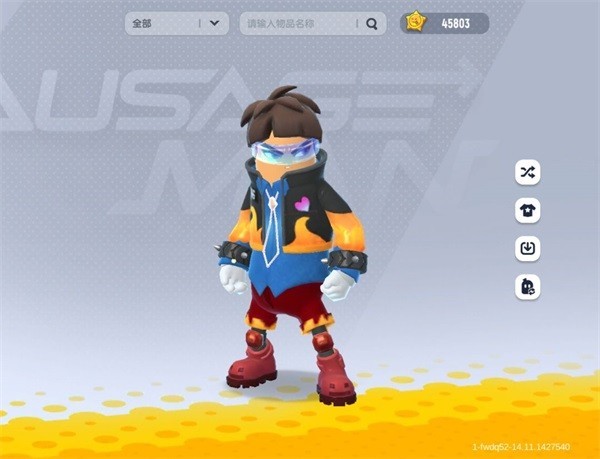 头发是呆呆村村民代表头发,眼睛是金刚武师的眼睛,面饰是梦幻狙击手的面饰,外套是暴走野兔的外套,上衣是舞锁王的上衣,裤子是孙悟空的裤子,鞋是达达的funny靴