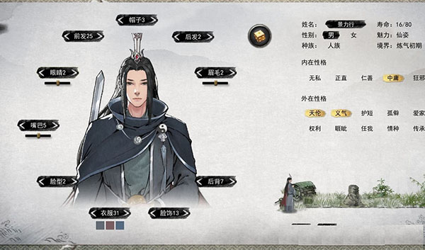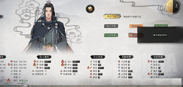 画面左下方显示的是游戏各项菜单的快捷按钮、当前的后天气运、境界阶段、时间、金钱资源、体力、灵力等基础属性。