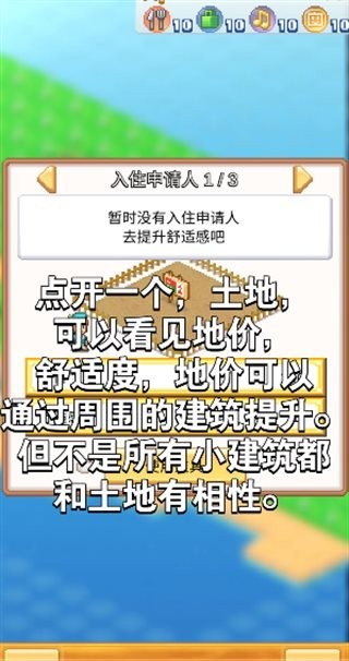 1、首选需要选择你的第一个居民,并选择一种性格,因为初始土地只有一块,所以他会自动选择入住