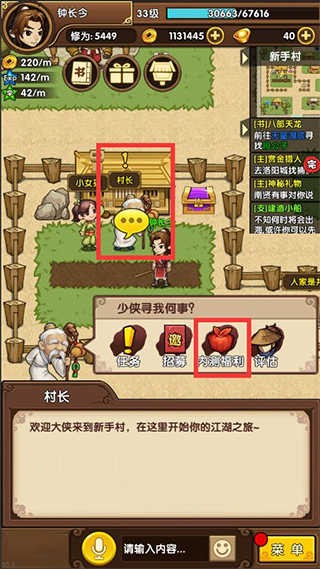 新手村:对话村长,完成任务,离开之际小女孩进入队伍,送你一本阵法(菜单→阵法,学习渔网阵),把村长招募了,去老婆婆那里,做完3个日常任务,把老婆婆也招募了,点布阵,把所招募的侠客上阵,再到武师,把野球拳和基本拳法升满。新手村有2个宝箱记得开启。