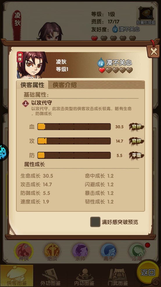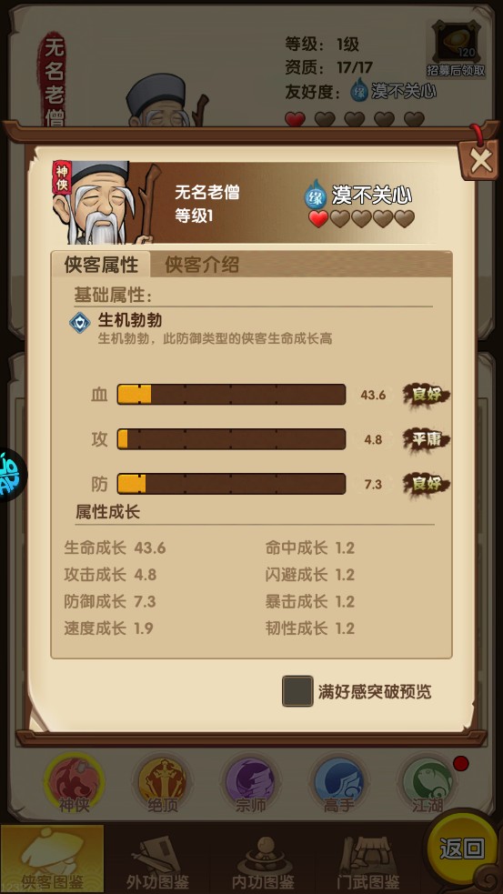 寻找天书:再次进入无名山洞,进入后自动对话山贼头子,选择招募,然后同样布阵到阵法中,阵法可上阵5人,队伍可同时存在10个角色,点击菜单→图鉴,亮头像的侠客,是可以入队/上阵的。把阵容补满后,进洞杀怪,打过5层boss完成任务,别着急回家,下第6层,保留节点,下次可直接进入第6层,另外在6层升到10级再回南贤居完任务。