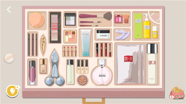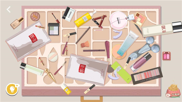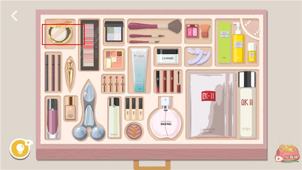 3、所有化妆品放进去之后,剩下粉扑无处安放,点击粉饼盒子打开。