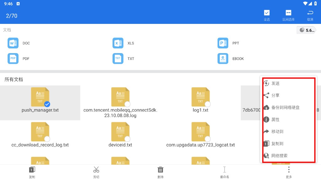 3、让文件在手机、电脑、网盘之间进行传输,并支持选择、复制、粘贴、剪贴、查看属性、解压、重命名、顶部等等功能。