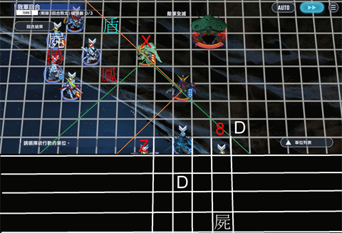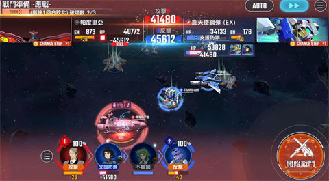 第二回合类似顺序,但因为先前残血角色不少,可以抓恶魔钢弹的2、5格反击以外的范围去上DEBUFF,并扣住所有援护在EXIA反击的回合做大量的援护伤害输出。