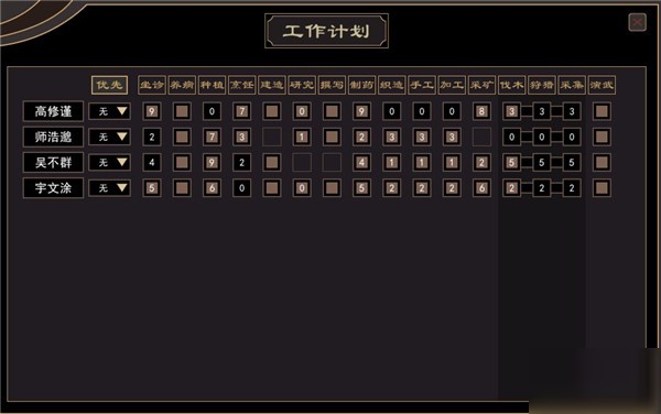 亮着的格子点一下就会变成黑色,黑色意味着这个人不会去干这件事情,同样的,亮着的就意味着这个人会去干这件事,如果你需要一个人去狩猎,那么你点亮狩猎就可以了,因为点数高的人效率更高,那么我们就应该尽量让点数高的人去干你希望干的事情,比如四个人物烹饪分别为7 3 2 0,那么7和3的人物烹饪更快也更容易成功,可是因为7是主人物,经常会出门,所以我让7 3都亮着,让2 0变成黑色。经常干一件事情的人相应的技艺点数会增加,比如你经常采矿,那你的采矿技艺就会一直缓慢增加,所以不要吝啬机会去培养你需要的人才。最前面一栏是优先,就是这个人物会专注于做的事情,一般来说所有人都会默认优先建造,如果你某个人物专注于干一件事情,比如伐木,那么你只需要优先伐木,这样就不会出现他突然跑去加工木板的情况了