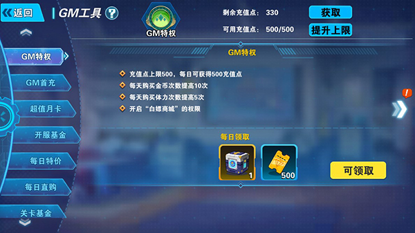 1、究极宝贝GM版内有着独特的GM工具,玩家可以免费获得GM特权,也可以通过充值解锁更高级别的GM特权。