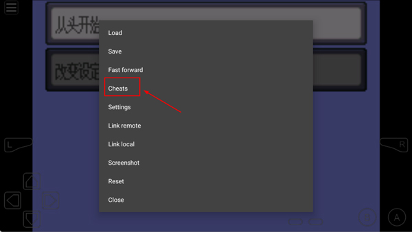1、打开模拟器,运行游戏后,点击如下图标,选择Cheats;