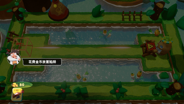 6、将金币拖到路上,布置陷阱,将野人弹到河里去;