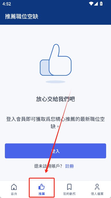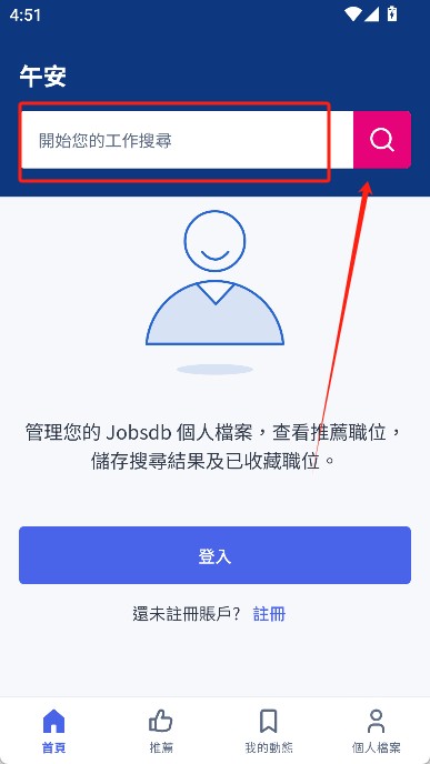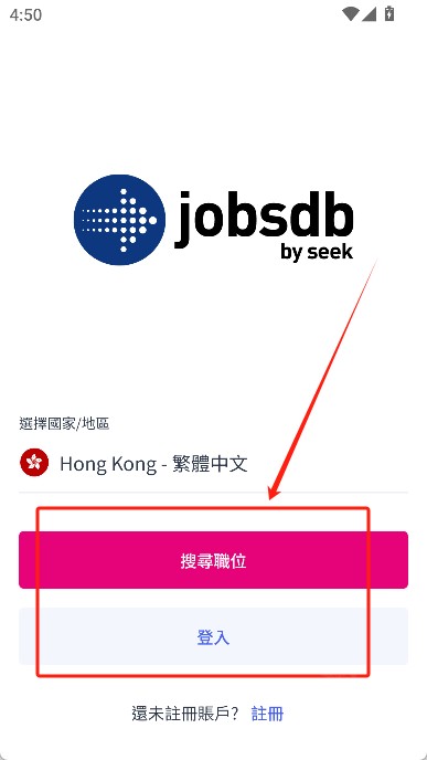 1、首先下载并安装app,打开之后你可以选择“登录”账号,也可以直接“搜寻职位”