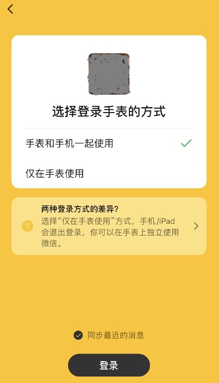 打开手机微信扫描手表微信中的二维码,点击登录,使用当前手机登录的成人微信帐号登录手表,可选择手表和手机一起使用或仅在手表使用。