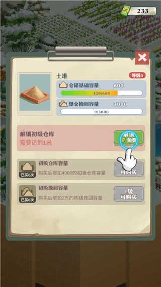 3、解锁你的初级仓库,可容纳更多沙土容量