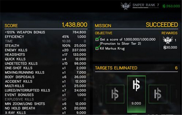 单纯刷分的一个关卡,使用分数加成最高的武器,连续的爆头击杀和秘密击杀,下图是过关的分值结构,枪支使用的是NARCISSUS(6级)。