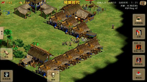 敌人民兵前来骚扰,这时用农民在从矿场到城镇中心一线用住房地基围住,并派一名采果农民躲进城镇中心(选中一名采果农民,点下方的“避难”)就可以轻松射死敌人民兵。待敌人死后,点击右侧的“出营”农民便会重新出来工作。