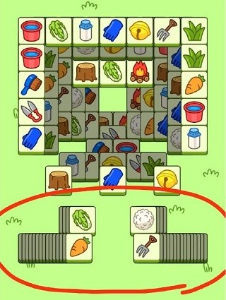 四行的最后一张牌翻出来之后,主要消上面大块的牌而且你最好保证,一个道具都不用,为什么要留下四行的最后一张牌呢?大家都知道道具第-格的用处是抽出三格摆上去,要用的时候就可以直接取用,相当于你原本七格的空间多了三格备用格,而那四行的最后一张牌也一样是备用格。