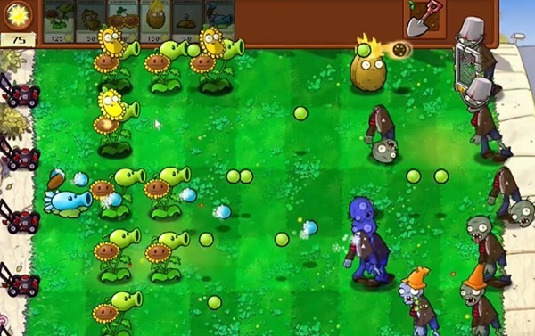 2、然后向日葵积累足够太阳之后,尽量每条道路都安排一个豌豆向日葵,如果僵尸比较难打,就在前方安排一个土豆。