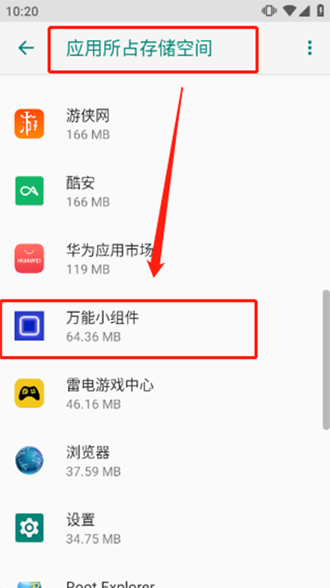 3、接下来进入“应用所占内存空间”,找到其中的万能小组件