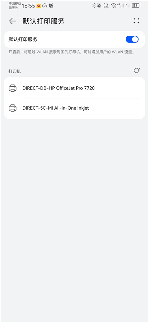 3、将打印机默认打印服务开启后,手机会自动搜索打印机,然后选择你的打印机进行连接即可