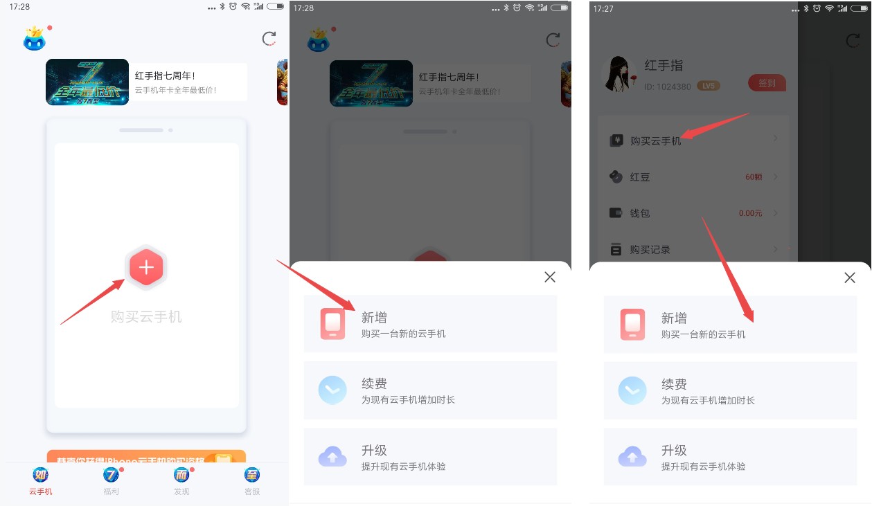 1)登录进入红手指云手机安卓版APP,在主界面后点击“+”号,弹出云手机新增/续费/升级功能栏,选择新增云手机;