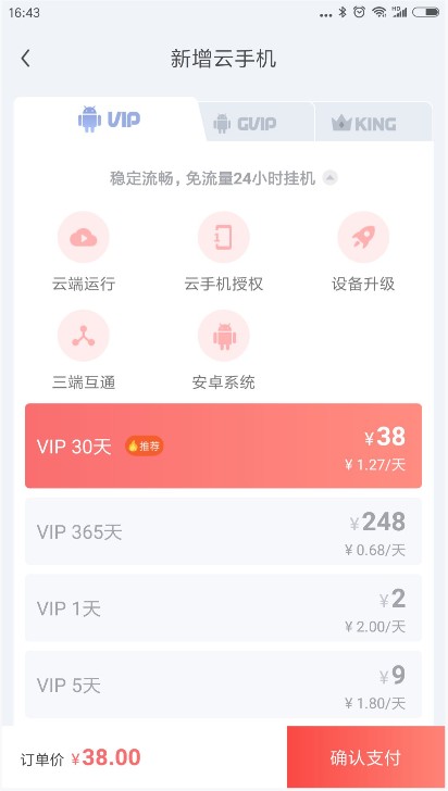 (注:VIP云手机30天套餐可选择使用百度钱包挂机续费,挂机续费则可节省三元。点击确认支付完成支付,点击确认。成功支付后用户主界面将增加一台云手机。