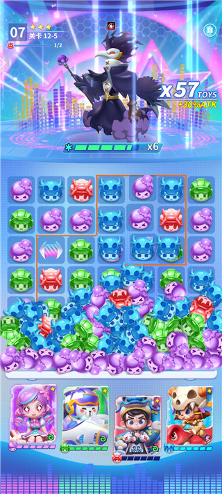 游戏的基础玩法就是通过消除为玩偶积攒技能,造成刷屏式的连击,消除越多,对关卡怪物造成的伤害越大。每个关卡有三星通关条件,还有许多障碍物限制玩家去轻松消除,阻止玩偶积攒技能,而玩家就是想办法让玩偶释放更多次技能,快速消灭怪物。
