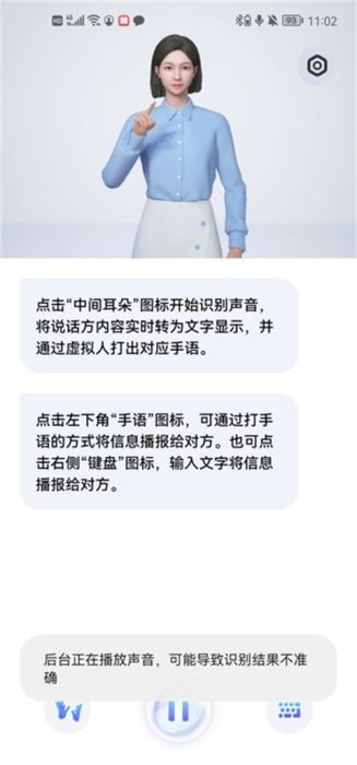 点击中间的耳朵还可以识别声音,大家只要直接讲出自己所要翻译的句子即可,然后上方就会自动通过虚拟人打出相对应的手语;