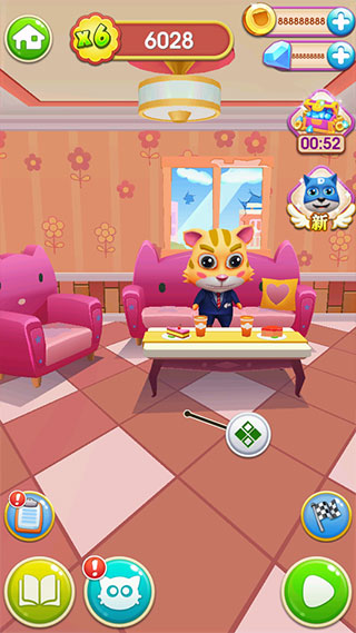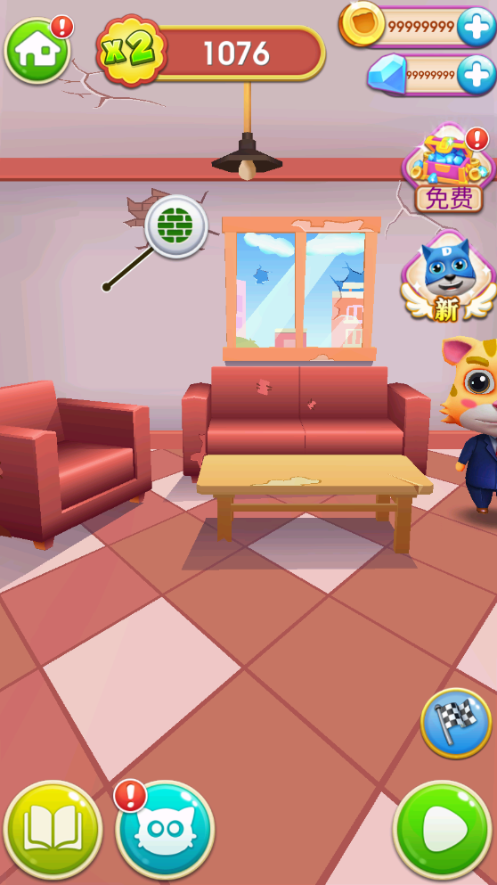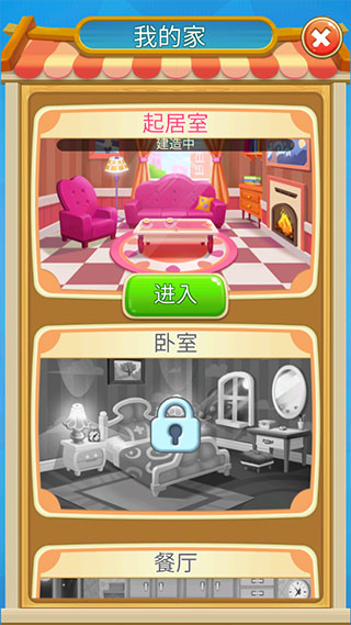 5、完成关卡挑战就可以获得大量金币和钻石,可以自由选择好看的家具进行装饰,右下角绿色按钮可以进入关卡挑战,旗子按钮可以匹配玩家进行比赛,左下角分别是皮肤、任务以及关卡模式。