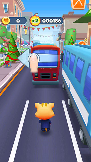 2、进入关卡赚取金币来装饰小家,向上滑动猫咪跳跃汽车障碍。