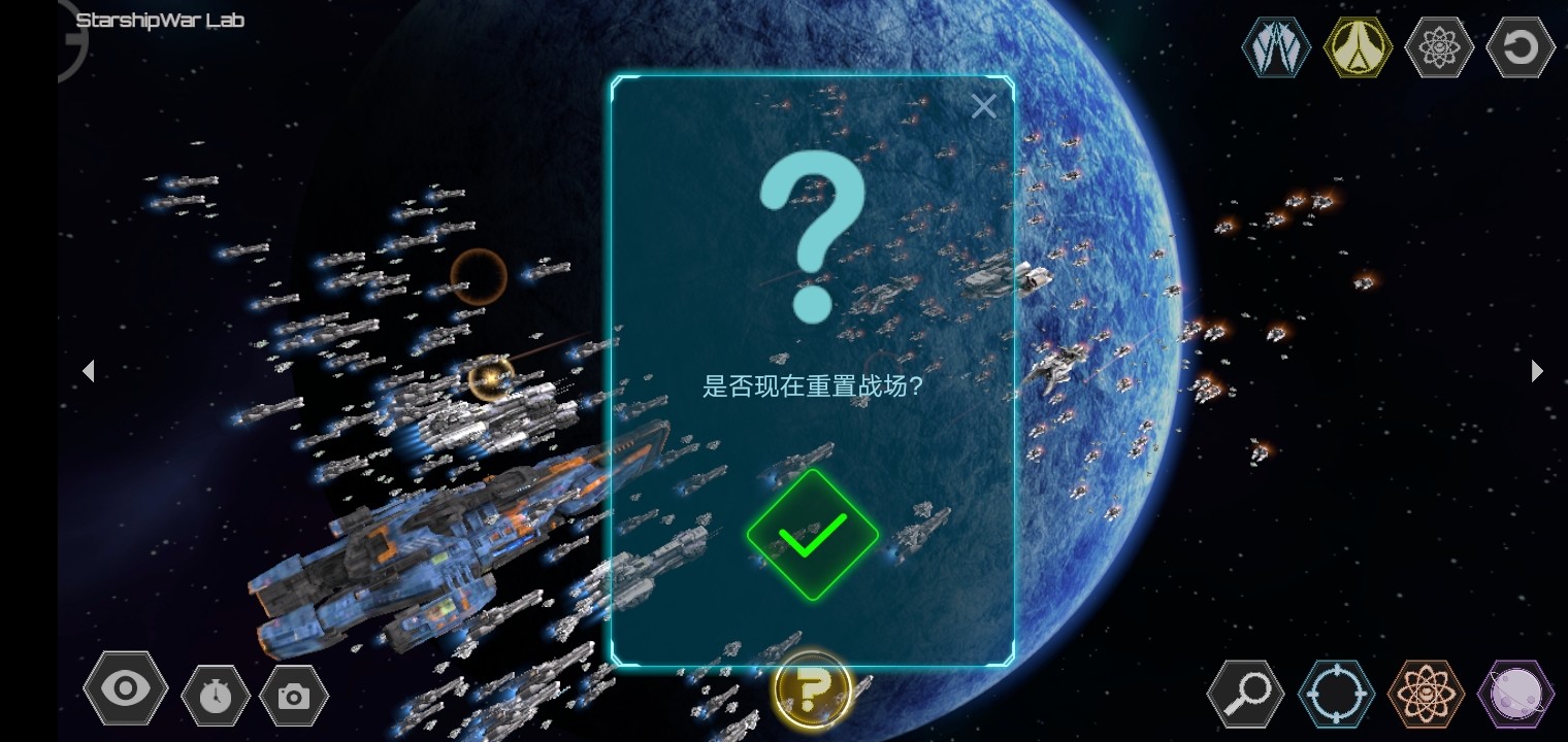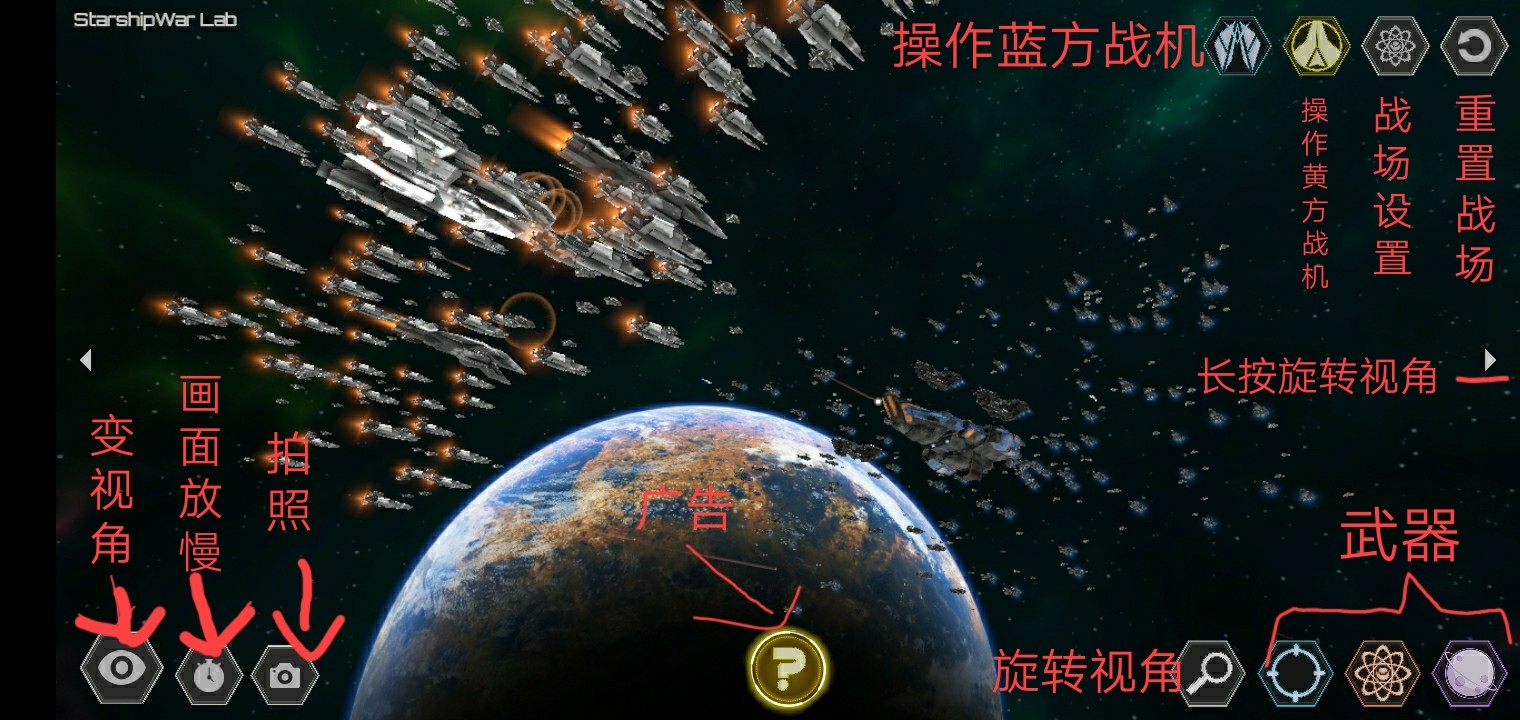6、上面右边五个依次为:操控蓝方战舰、操控黄方战舰、操控水滴、选择战舰数量及自动开火密度、重置战场。