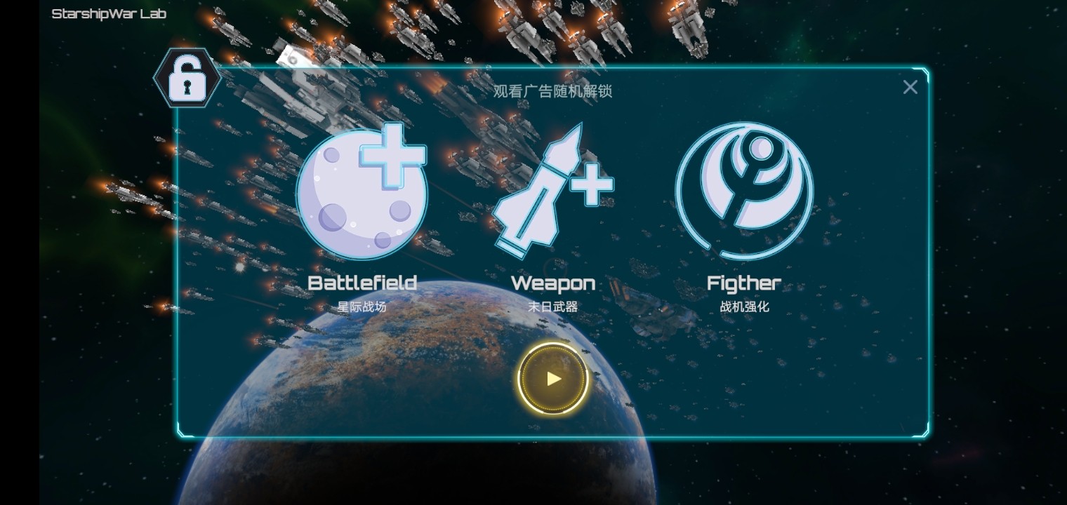 4、下面一排中间的是广告,可以通过看广告获得技能,可操控战机的皮肤,背景星球等。